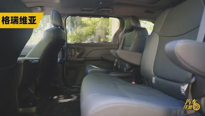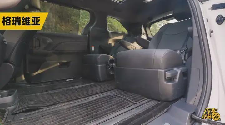 來到第二排,格瑞維亞還是以照顧家人和實用性為主要目的,配置沒那么炫酷,沒有彩電冰箱,但注重細節。座椅座體很寬,填充物也很軟很厚實,座椅兩側可調節的扶手方便老人孩子上下車。