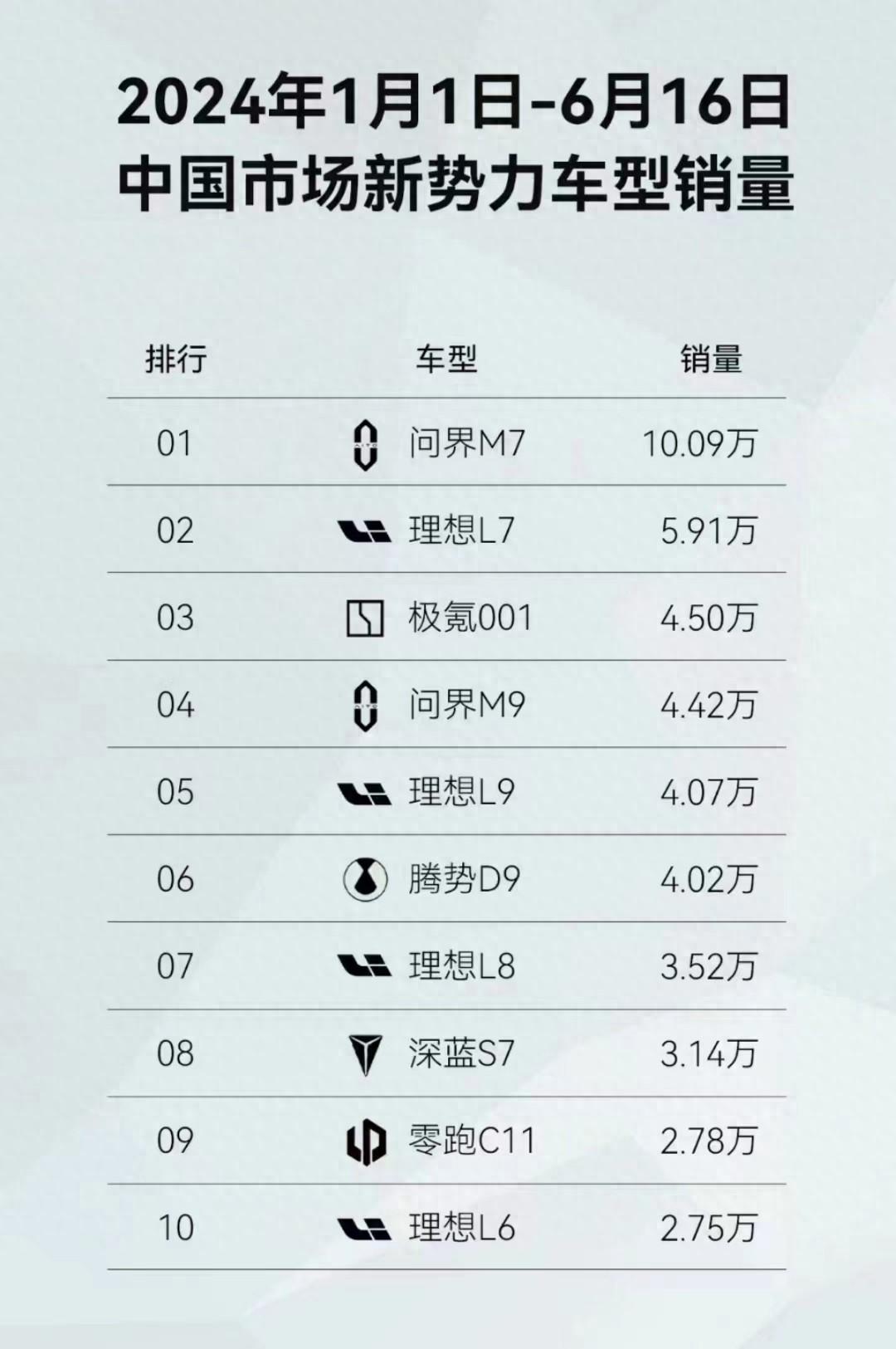 最近,國(guó)產(chǎn)中高端新能源車型,今年1月1日-6月16日的銷量匯總曝光,涉及蔚小理等新勢(shì)力,極氪、深藍(lán)、騰勢(shì)等“創(chuàng)二代”,及華為跨界賦能的問界等品牌車型,榜單的前十名,還是相當(dāng)有看點(diǎn)的。