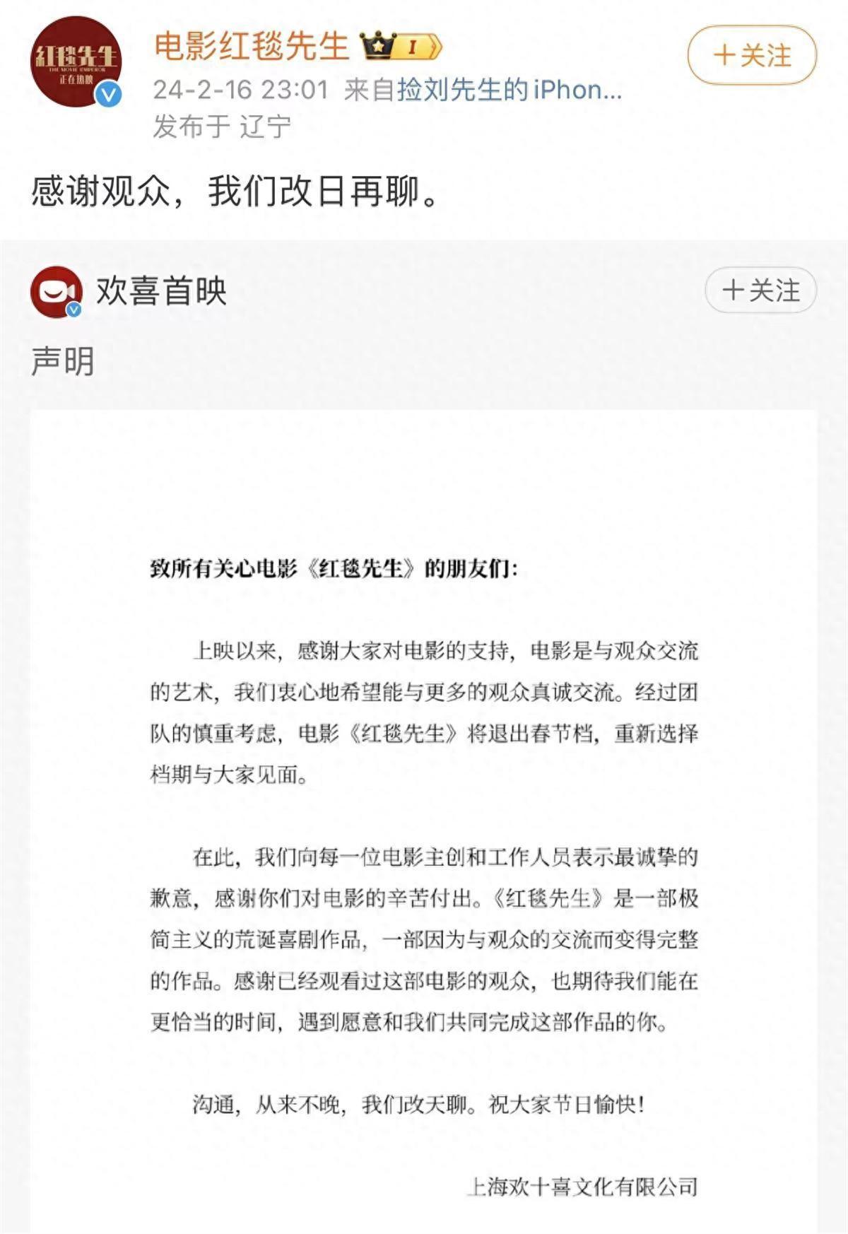 2024春節(jié)檔即將結(jié)束,但檔期影市仍在上演風(fēng)云變幻。2月16日晚,由寧浩執(zhí)導(dǎo)、劉德華主演的電影《紅毯先生》突然宣布退出春節(jié)檔,重新選擇檔期與觀眾見面。這是繼韓延導(dǎo)演的《我們一起搖太陽》2月14日晚宣布撤檔后,又一部臨時撤退的春節(jié)檔電影。