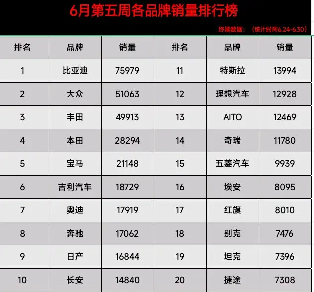 6月對于所有品牌可謂非常的好,各車企銷量都出現較大幅度增長。其中6月最后一周品牌銷量排行榜中,比亞迪銷量達75979奪得冠軍,大眾、豐田、緊隨其后位列前三,吉利汽車、奔馳、日產、長安、入圍前十名。特斯拉、AITO、埃安、均無緣前十之列。