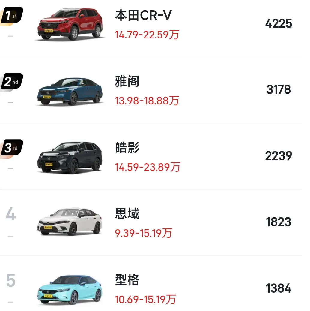 其中本田銷量較好10款車型分別為T本田CR-V、雅閣、皓影、思域、型格、英仕派、奧德賽、本田HR-V、艾力紳、冠道、其中本田CR-V銷量4225輛,排在第1、雅閣銷量3178輛,排在第2、皓影銷量2239輛,排在第3、思域銷量1823輛,排在第4、型格銷量1384輛,排在第5、英仕派銷量951輛,排在第6、奧德賽銷量758輛,排在第7、本田HR-V銷量647輛,排在第8、艾力紳銷量405輛,排在第9、冠道銷量339輛,排在第10。