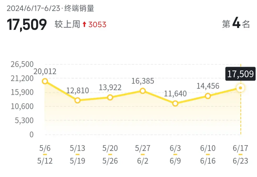 最新6月第四周品牌銷量排行榜中本田排名第4,其中本周銷量為17509輛。較上周有小幅度增長3053輛。