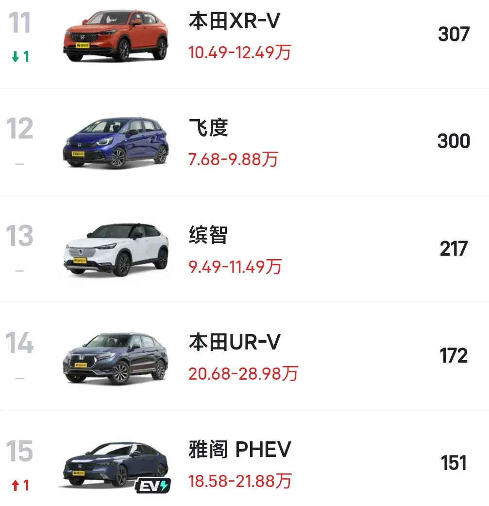 而剩余排11-20名銷量卻大不如從前,其中本田XR-V銷量307輛排在第11、飛度銷量300輛排在第12、繽智銷量217輛排在第13、本田UR-V銷量172輛,排在第14、雅閣 PHEV銷量151輛,排在第15、e:NP2 極湃2銷量97輛,排在第16、本田CR-V PHEV銷量97輛,排在第17、ZR-V致在銷量66輛,排在第18、本田LIFE銷量50輛,排在第19、皓影 PHEV銷量32輛,排在第20。