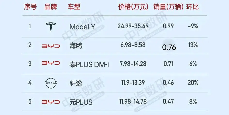 首先排在第一梯隊的有:Model Y、海鷗、秦PLUS DM-i、軒逸、元PLUS,其中Model Y銷量0.99萬輛,環比增減幅度為-9%、海鷗銷量0.76萬輛,環比增減幅度為13%、秦PLUS DM-i銷量0.71萬輛,環比增減幅度為6%,排名第3名、軒逸銷量0.46萬輛,環比增減幅度為20%,排名第4名、元PLUS銷量0.47萬輛,環比增減幅度為8%,排名第5名。