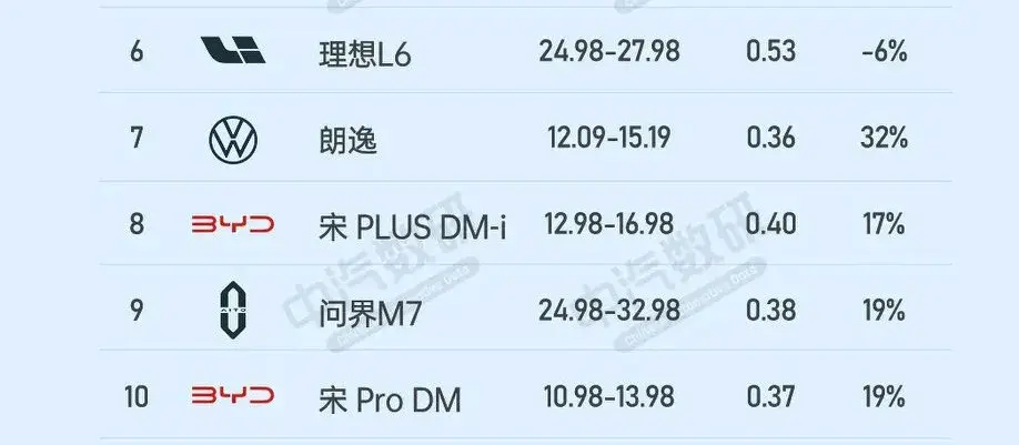 排第二梯隊車有:理想L6、朗逸、宋 PLUS DM-i、問界M7、宋 Pro DM,其中理想L6銷量0.53萬輛,環比增減幅度為-6%,排名第6名、朗逸銷量0.36萬輛,環比增減幅度為32%,排名第7名、宋 PLUS DM-i銷量0.4萬輛,環比增減幅度為17%,排名第8名、問界M7銷量0.38萬輛,環比增減幅度為19%,排名第9名、宋 Pro DM銷量0.37萬輛,環比增減幅度為19%,排名第10名、