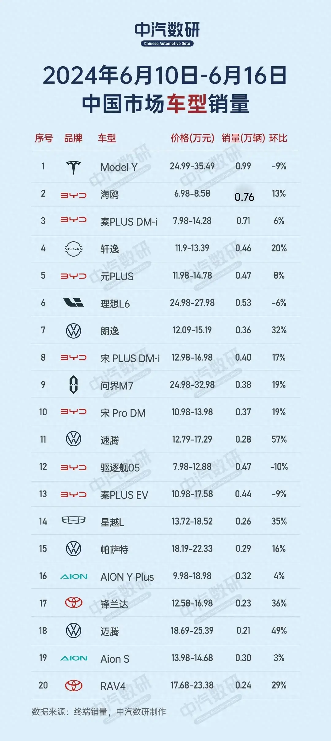 一直以來,比亞迪多同款車被拆分銷量排行飽受爭議,最新6月第三周銷量榜榜單也是引起熱議,秦PLUS DM-i銷量0.71萬輛及秦PLUS EV銷量0.44萬輛,再次無緣榜首,而本周Model Y碾壓秦PLUS DM-i奪得第一。具體來看排名詳細數據:
