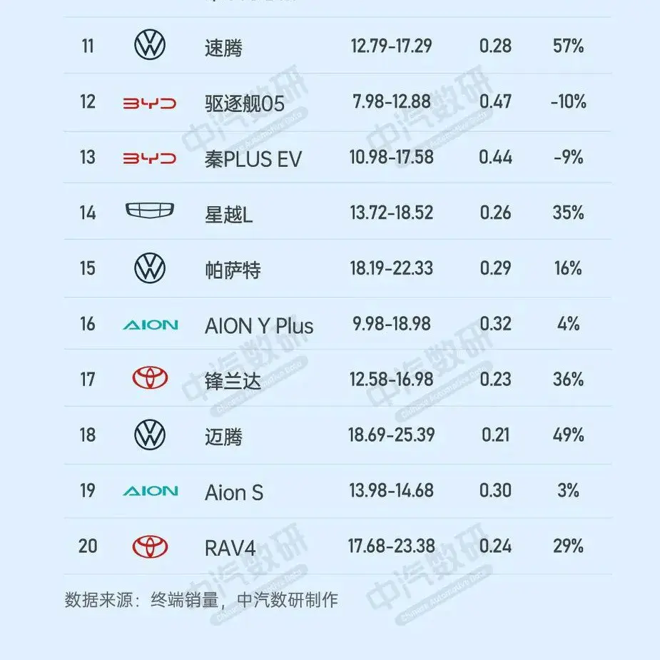 而剩余TOP11-TOP20競爭激烈,速騰銷量0.28萬輛,環比增減幅度為57%,排名第11名、驅逐艦05銷量0.47萬輛,環比增減幅度為-10%,排名第12名、秦PLUS EV銷量0.44萬輛,環比增減幅度為-9%,排名第13名、星越L銷量0.26萬輛,環比增減幅度為35%,排名第14名、帕薩特銷量0.29萬輛,環比增減幅度為16%,排名第15名、AION Y PIuS銷量0.32萬輛,環比增減幅度為4%,排名第16名、鋒蘭達銷量0.23萬輛,環比增減幅度為36%,排名第17名、邁騰銷量0.21萬輛,環比增減幅度為49%,排名第18名、Aion S銷量0.3萬輛,環比增減幅度為3%,排名第19名、RAV4銷量0.24萬輛,環比增減幅度為29%,排名第20名。