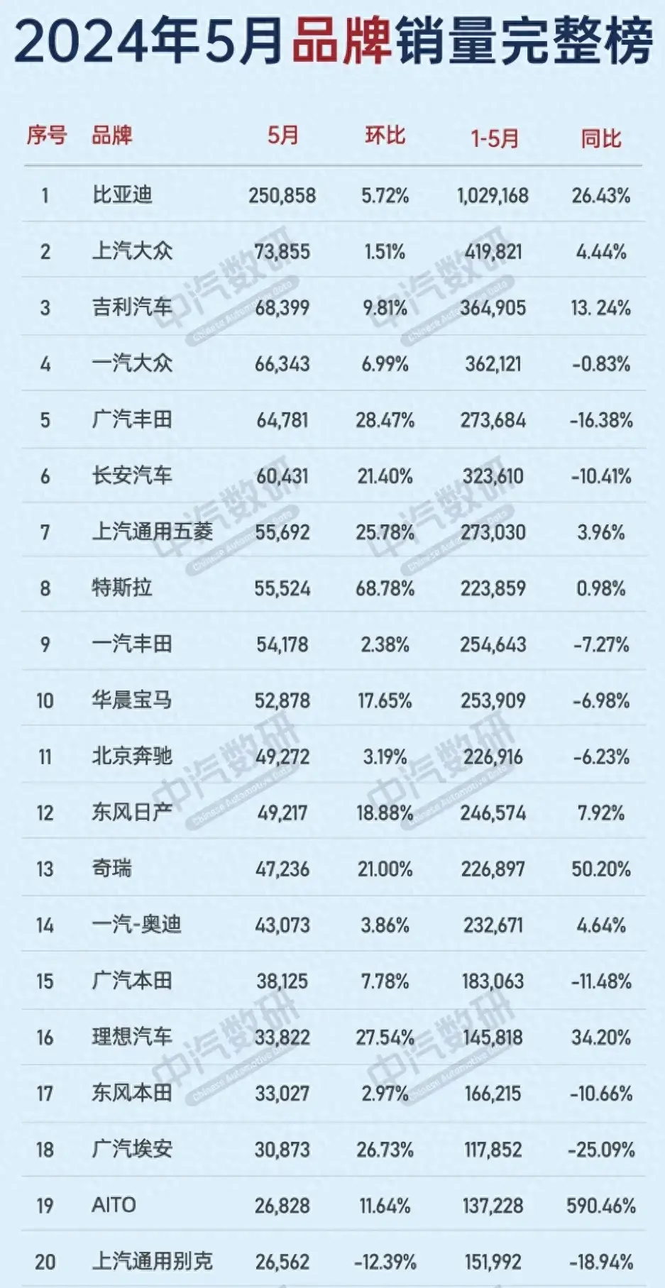 2024年5月汽車品牌銷量,比亞迪,以驚人的25萬輛的銷量領跑全場