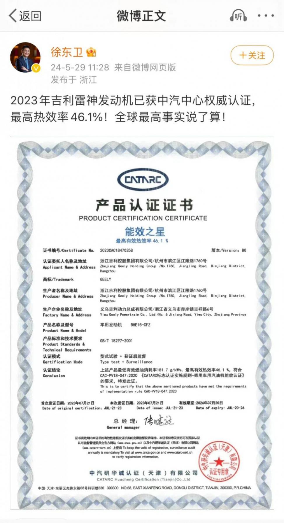 吉利汽車高管徐衛(wèi)東在29日中午,發(fā)布了一條關(guān)于吉利雷神發(fā)動(dòng)機(jī)已經(jīng)在2023年拿下46.1%最高熱效率認(rèn)證,并且喊出了“全球最高事實(shí)說(shuō)了算”的口號(hào),而且還號(hào)召媒體和KOL轉(zhuǎn)發(fā),我的朋友圈可熱鬧了……