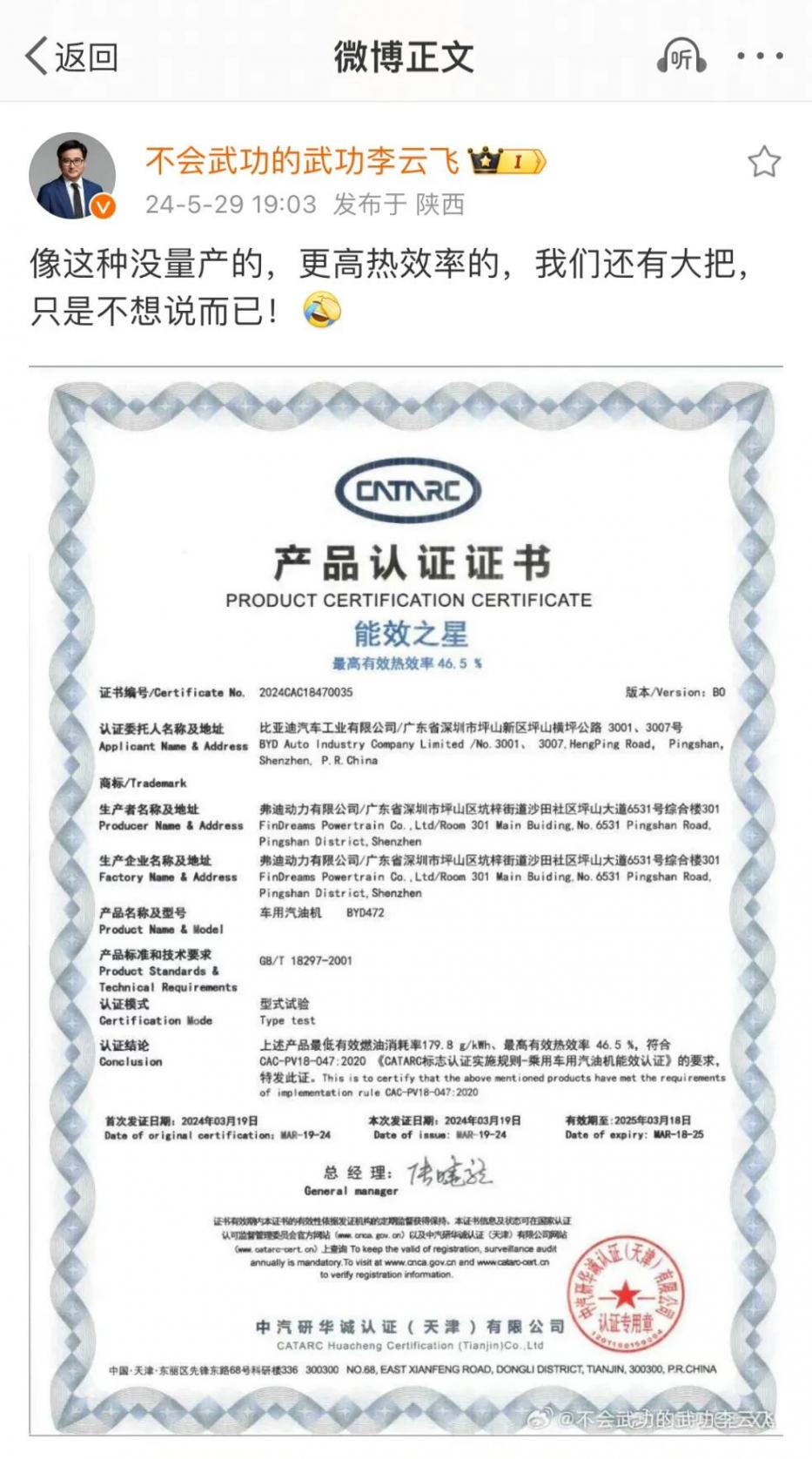 要說(shuō)李云飛也真是耐得住性子,話只說(shuō)了一半,到了晚上7點(diǎn),也就是“迪粉”大會(huì)開始的時(shí)候,這位老哥在社交平臺(tái)上傳了一張同樣是中汽中心出具,熱效率達(dá)到46.5%的比亞迪某款發(fā)動(dòng)機(jī)的熱效率認(rèn)證,并且“輕描淡寫”配文:像這種沒(méi)有量產(chǎn)的,更高熱效率,我們還有一大把,只是不想說(shuō)而已。還配了一個(gè)捂臉苦笑的表情包,給人的感覺(jué)就是,這種王者戰(zhàn)青銅的戰(zhàn)局,好沒(méi)意思!順便還預(yù)告了一下“后招”,我們可以有熱效率46.5%的發(fā)動(dòng)機(jī)技術(shù)儲(chǔ)備哦!