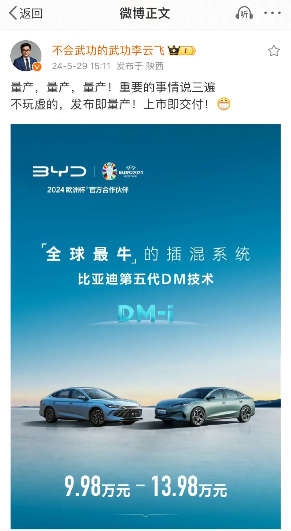 比亞迪品牌及公關(guān)處總經(jīng)理李云飛,也迅速開始講事實(shí),擺依據(jù)!29日下午3點(diǎn)多,李云飛在社交平臺(tái)發(fā)布消息,強(qiáng)調(diào)了量產(chǎn)、量產(chǎn)、量產(chǎn)!言下之意就是說(shuō),咱別拿實(shí)驗(yàn)室的數(shù)據(jù)說(shuō)話哈,第五代DM技術(shù)下46.05%的發(fā)動(dòng)機(jī)熱效率,就是當(dāng)下量產(chǎn)車型中最高的。