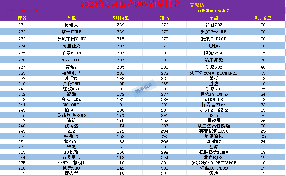 最后就是榜單的201-320名:納米BOX、凱翼昆侖、哈弗梟龍MAX、ZEEKR X、奧迪Q6、飛行家、坦克500和領裕的銷量均不足400輛。而在5月里銷量不足10輛的車型有12款,分別是星途追風 C-DM、奧迪e-tron、小鵬G3、長安CS95、廣汽豐田bZ4X、RAV4榮放雙擎E+、發現運動版PHEV、哈弗H6新能源、一汽豐田bZ4X、啟辰T60、廣汽本田VE-1和星越L 增程電動版,近期有購買這些車型的消費者需要注意了,一不小心買回來就成為絕版車。