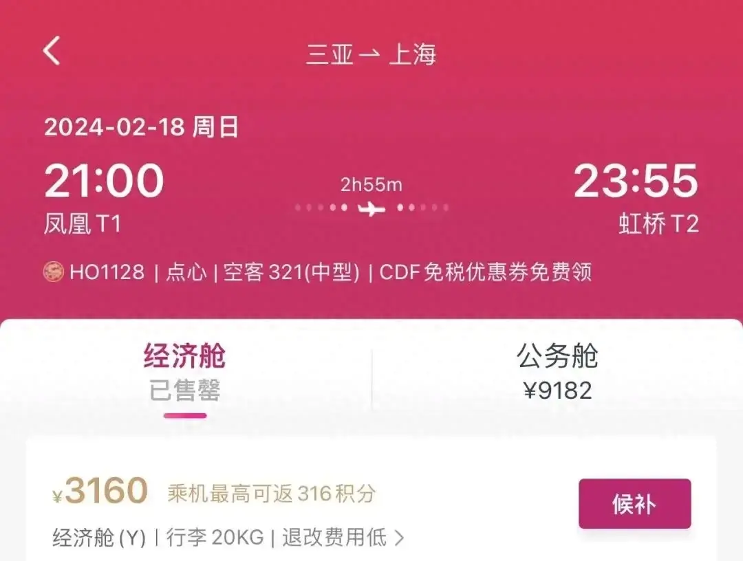2月17日三亞-上海已無直飛機票,2月18日吉祥航空HO1128三亞鳳凰-上海虹橋航班開放經濟艙機票候補,價格為3160元。海南航空官網則顯示,2月18日三亞至長沙航班經濟艙機票售罄,公務艙價格降至為6290元。