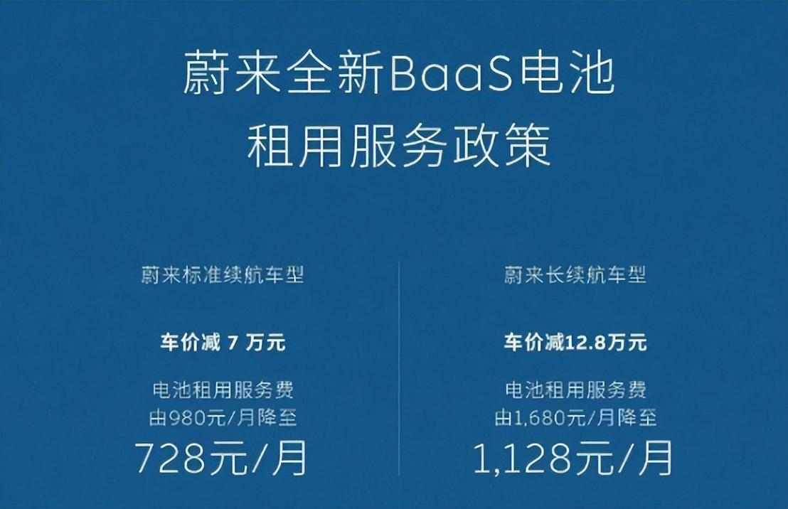 接下來,我們說說蔚來是如何揚長避短的。筆者將其分為三部分,首先就是在3月14日蔚來調整了BaaS電池租用服務政策,標準續航電池包車價立減7萬元,月服務費下調為738元,長續航電池包車價立減12.8萬元,月服務費調整為1128元,價格更加優惠。