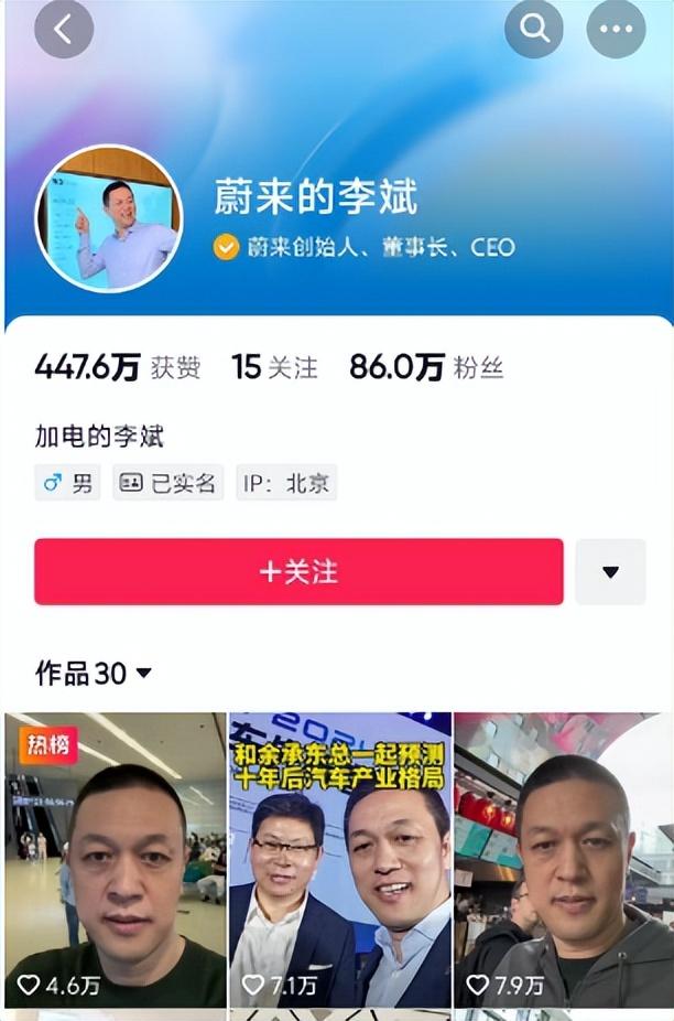 在某短視頻平臺,李斌的粉絲為86萬,獲贊達447.6萬,也為蔚來帶來了許多流量。
