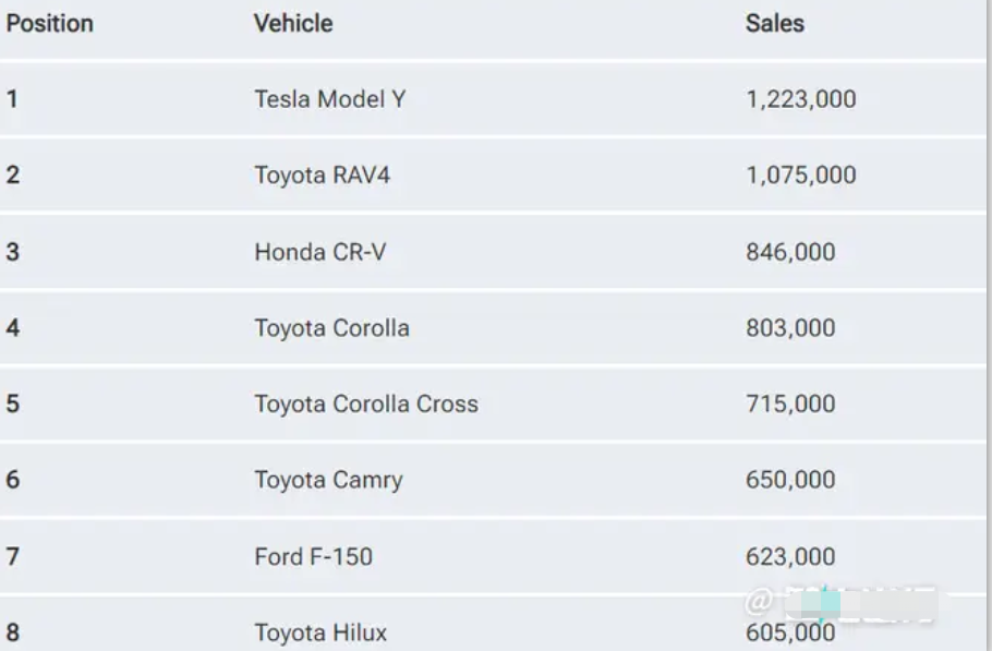 具體來看,特斯拉Model Y在2023年的總銷量達到了122.3萬輛,遙遙領先其他車型,輕松奪得年度銷量冠軍。緊隨其后的是豐田RAV4,銷量為107.5萬輛,排名第二;本田CR-V以84.6萬輛的銷量位居第三;第四名和第五名分別是豐田卡羅拉(80.3萬輛)和豐田卡羅拉Cross(71.5萬輛)。