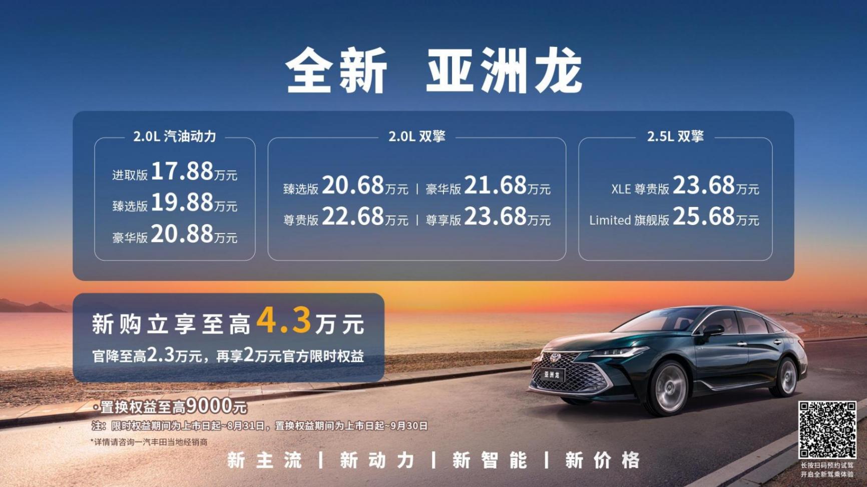 7月12日,全新亞洲龍正式上市,新車共推出9款車型,售價區間為17.88萬-25.68萬元。新車提供雙前臉外觀可選,并擁有全新的車身配色。與此同時,該車還將搭載最新的Toyota Space智慧空間與Toyota Pilot高階智駕系統。動力方面,全新亞洲龍搭載提供2.0L自然吸氣、2.0L雙擎和2.5L雙擎三種動力可選。