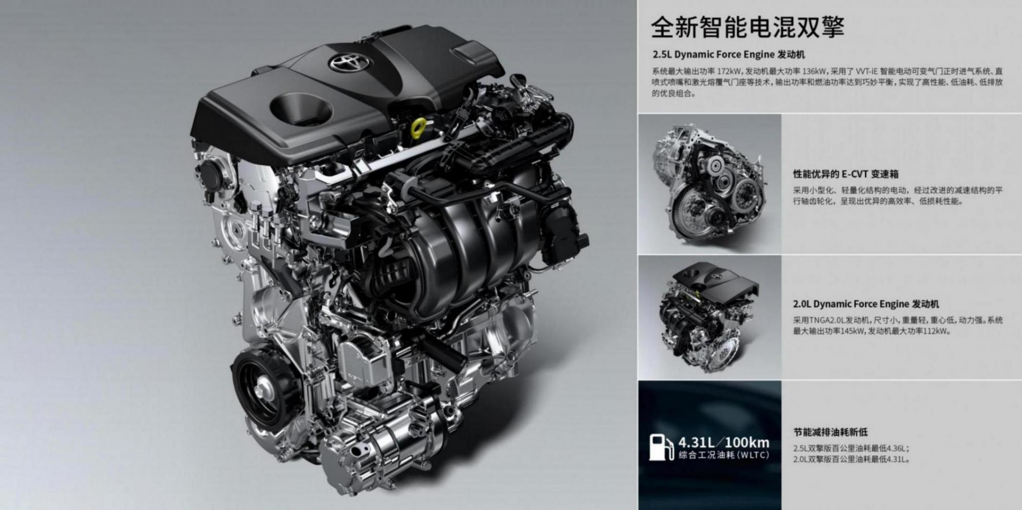 動力方面,新車提供2.0L自然吸氣、2.0L智能電混雙擎和2.5L雙擎三種動力可選。其中,2.0L自然吸氣發動機最大功率達127kW,最大扭矩206N·m,匹配CVT無級變速(模擬10擋)。2.5L混動版車型發動機最大功率為136kW,系統綜合最大功率達169kW,匹配E-CVT無級變速。2.0L第五代智能電混雙擎系統,發動機最大功率112kW,系統綜合最大功率達145kW,匹配E-CVT無級變速,百公里油耗4.31L,一箱油可以行駛1000km。
