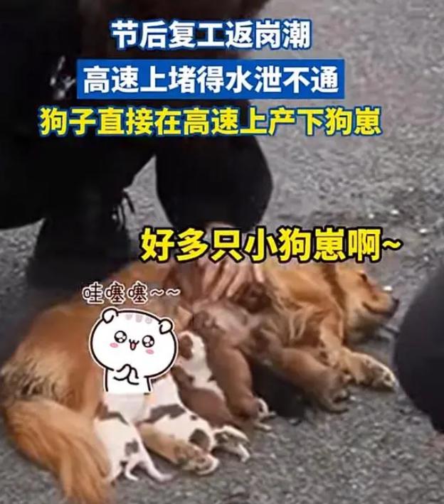 那天凌晨,一家人帶著他們的寵物金毛犬出發,原計劃早上便能駛離湖南,沒想到卻遭遇了嚴重的交通堵塞,直到中午還在原地打轉。在等待的無聊之際,他們的金毛犬突然產生了生產的癥狀。這讓主人措手不及,不過他們還是迅速停車,幫助金毛犬順利生產,并記錄下了這一溫馨的瞬間。