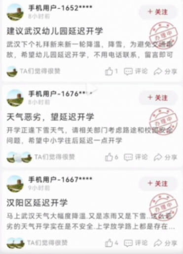 有市民在武漢城市留言板上建議:“2月21日中小學(xué)開學(xué)在即,但雨雪天氣也隨之而來……希望有關(guān)部門依據(jù)天氣適當(dāng)調(diào)整返校時(shí)間。”