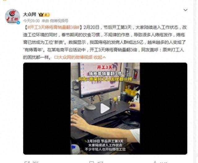2月20日,節后開工第3天,大家陸續進入工作狀態,改造工位環境的同時,春節期間的飲食習慣,不規律的作息,導致很多人痔瘡發作,痔瘡膏已然成為工位“新貴”。數據顯示,我國痔瘡的發病人群或達5億,越來越多的人變成了“有痔青年”。在某電商平臺活動中,開工3天痔瘡膏銷量翻3倍,網友直呼:原來打工人的困擾都一樣。
