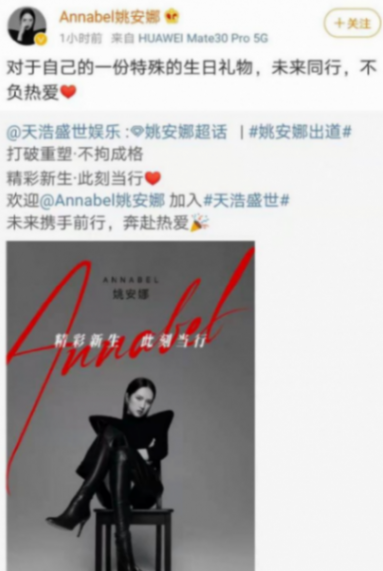 2021年1月10日,姚安娜簽約天浩盛世,當(dāng)年1月14日正式在個(gè)人微博上宣布出道。
