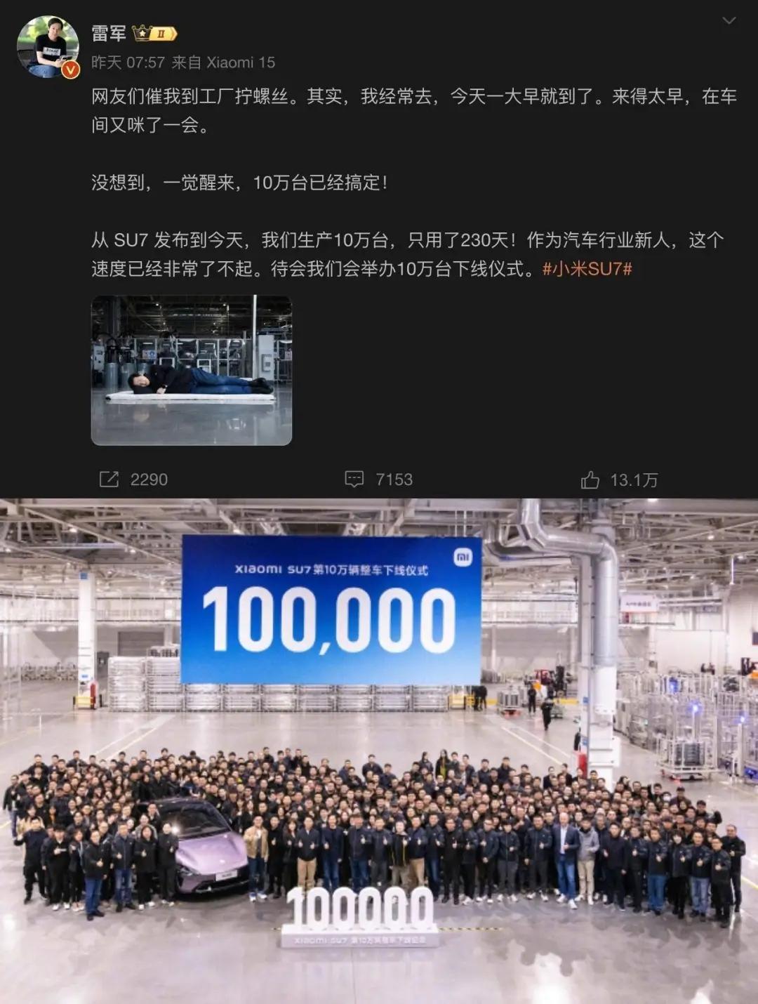 因小米SU7產能有限交付周期長,網友在線喊話雷軍去工廠擰螺絲催進度,這不,人家真去了,還因為去的太早,在車間瞇了一會。一覺醒來,第十萬臺小米SU7已經下線了。但在隨后直播中,雷軍表示睡覺是“擺拍”,迅速登上熱搜。
