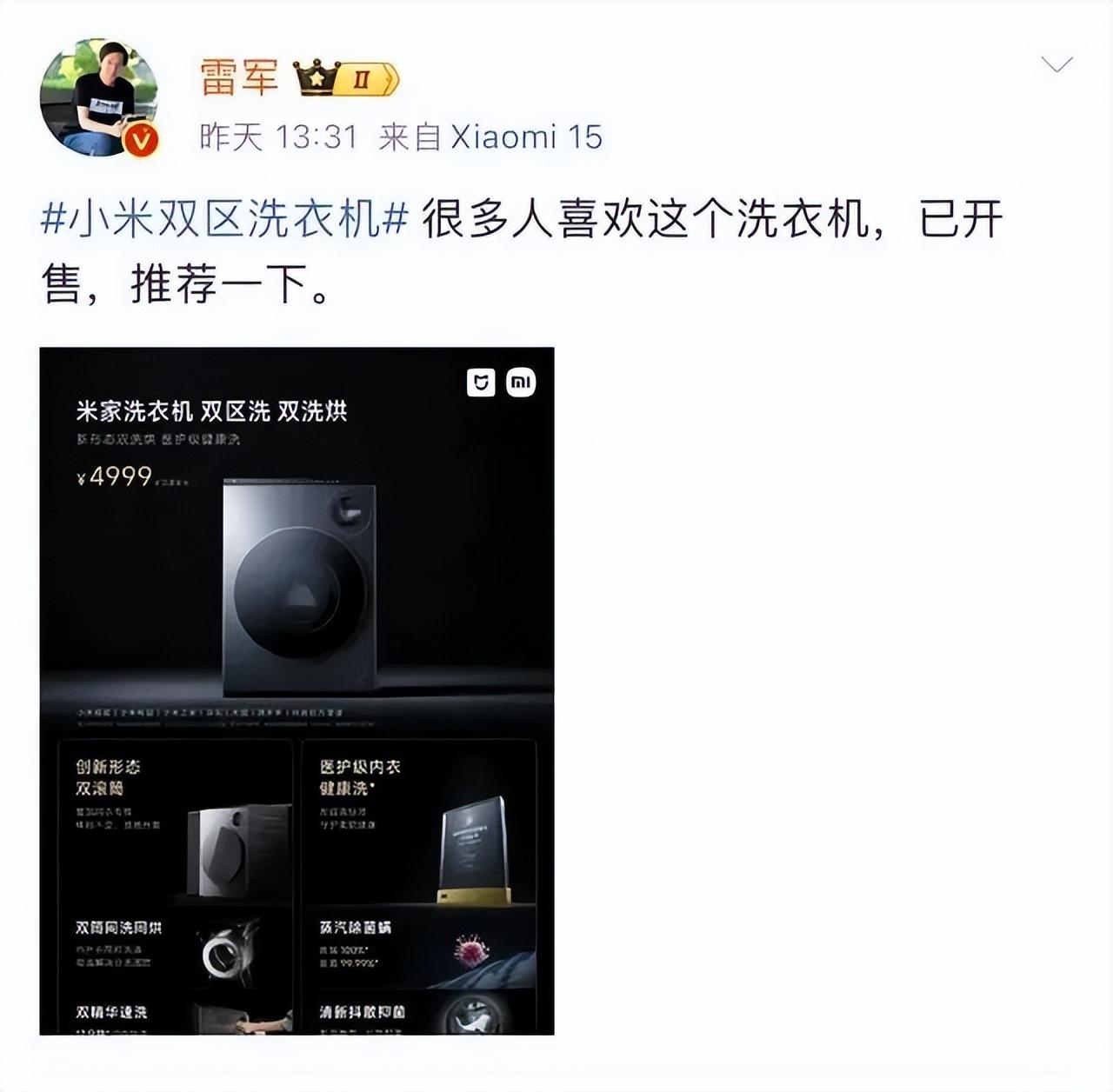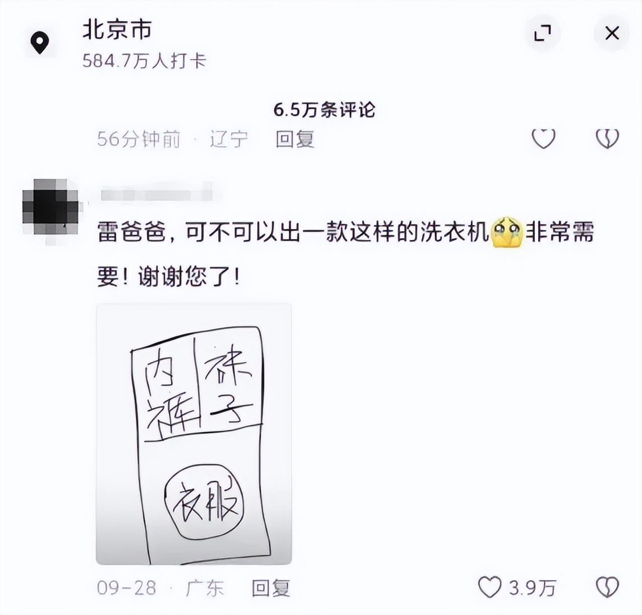 之前有網友給雷總附上了自己手繪的洗衣機示意圖,并留言:雷爸爸,可不可以出一款這樣的洗衣機,非常需要!謝謝您了!結果雷軍一聲不吭,直接推出了小米雙區洗衣機,可以把衣服和內衣分開洗。