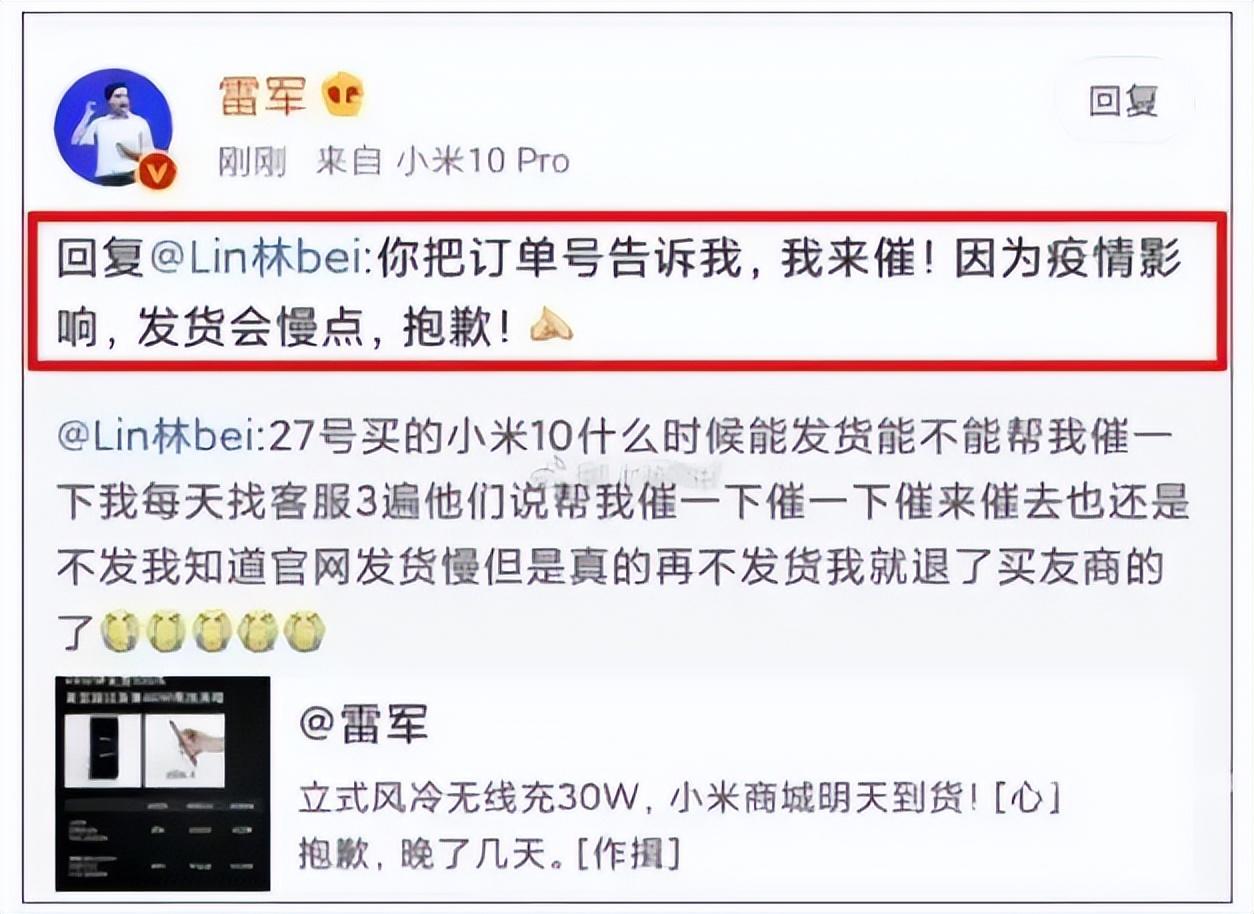 11月11日,小米15發布以后,有網友留言:“自己的定制色十幾天了還沒發貨,讓雷總擰螺絲去”,結果雷總直接回復:“我去催一下”,然后就直接去找了盧偉冰。早在2020年,有消費者表示自己的手機多日未發貨,找客服催了三次也沒有動靜,再不發就要選友商的手機了。結果雷軍直接要訂單號,并表示自己親自來催。