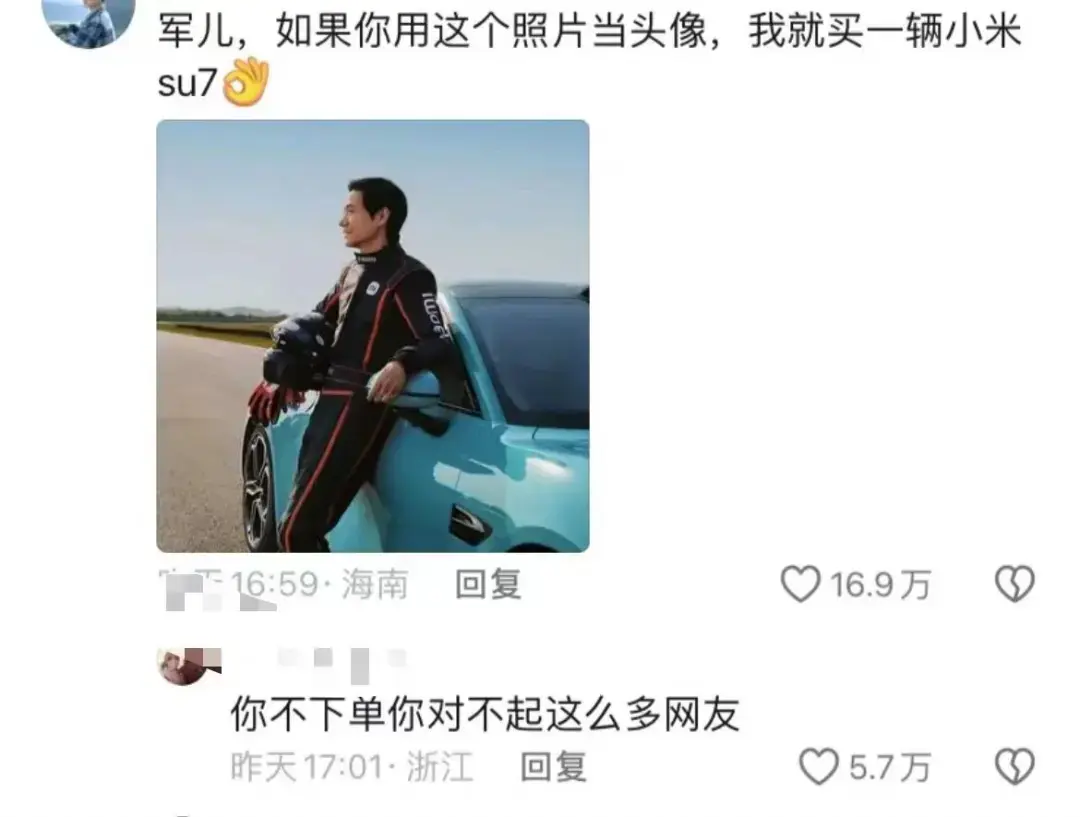 雷軍除了寵粉,還比較聽勸。為了能造出更好的汽車,雷軍不僅開了150輛不同的車型,還考取了賽車駕照,晚起了漂移。在第五次年度演講前,雷軍帶來了漂移視頻,并表示這是給網友交的作業。這事被網友調侃:“千億CEO給我交作業”。因為網友的一句話:“軍兒,如果你用這個照片當頭像,我就買一輛小米SU7”,就讓這位身價千億的CEO“軍兒”換了頭像。在小米SU7交付時,雷軍還親自開車門。