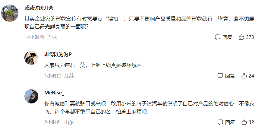 對于雷軍的這次“擺拍”,不僅沒有引發網友的不滿或聲討,反而收獲了大量點贊和祝福。甚至很多網友擔心雷總躺在地上會著涼。正如網友所說:“哪個千億富豪能像雷軍一樣逗網友們開心呢?”“有哪個身價千億的企業家愿意壓上自己的全部信譽造車呢?”