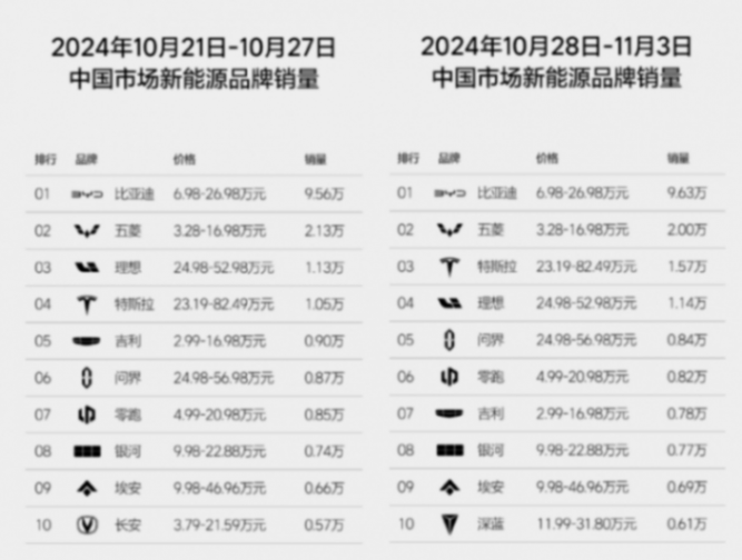 第44周新能源汽車銷量排行榜出爐,理想汽車連續28周排名第一,小米汽車銷量大跌,深藍汽車銷量提升明顯,排名取代小米,特斯拉銷量暴漲,排名上升,問界、零跑汽車銷量保持穩定,排名膠著。