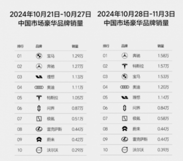 在中國豪華品牌銷量排行榜中,奔馳汽車以1.58萬輛的成績再次奪冠,銷量比上周增長了0.31萬輛。特斯拉雖然暴漲0.52萬輛,但與奔馳汽車相比,仍有100輛左右的差距,排名第二。寶馬汽車本周銷量為1.53萬輛,比上周增長了0.24萬輛,仍不及奔馳和特斯拉銷量,排名下降至第三名。奧迪本周銷量增長不明顯,共交付1.2萬輛,排名第四。理想汽車雖然銷量微增,但不及BBA和特斯拉的增幅,排名下降至第五名。問界、極氪、蔚來分別排名第六至第八名。本周的豪華車銷量排名變化顯示,在豪華品牌市場,傳統車企仍然具有強大的競爭力,而新能源汽車品牌還需要更加努力,才能在這一領域站穩腳跟。