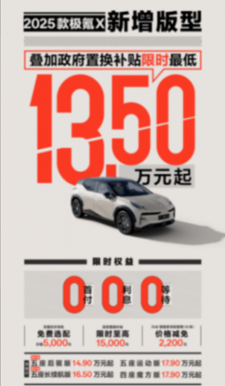 2025款極氪X新版車型在11月1日(今日)正式上市,最低售價14.9萬,疊加政府置換補貼后最低13.5萬元,同時還調整了老款車型價格。除了價格上的優惠,全系車型還可享受0首付、0利息的金融政策,權益價值最高可達6.32萬元。同時,購車者還能享受18000元的政府置換補貼等額外優惠。