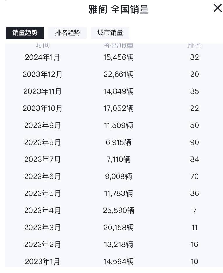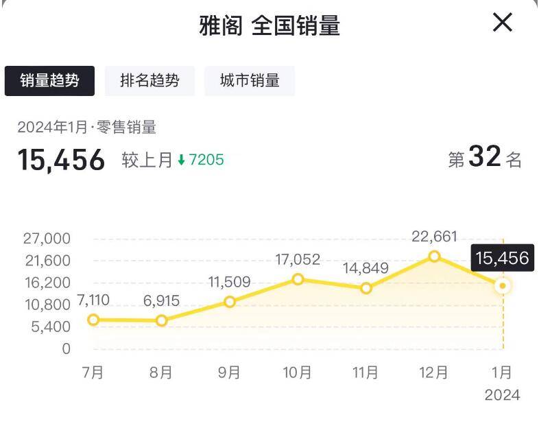 一則、2024年1月份,雅閣的單月零售銷量依然超過了1萬臺。行業綜合銷量數據顯示,2024年1月份,雅閣的單月零售銷量為15456臺。