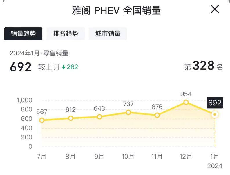 行業綜合銷量數據顯示,2024年1月份,本田雅閣PHEV的單月零售銷量僅為692臺,呈現出環比走低的趨勢。