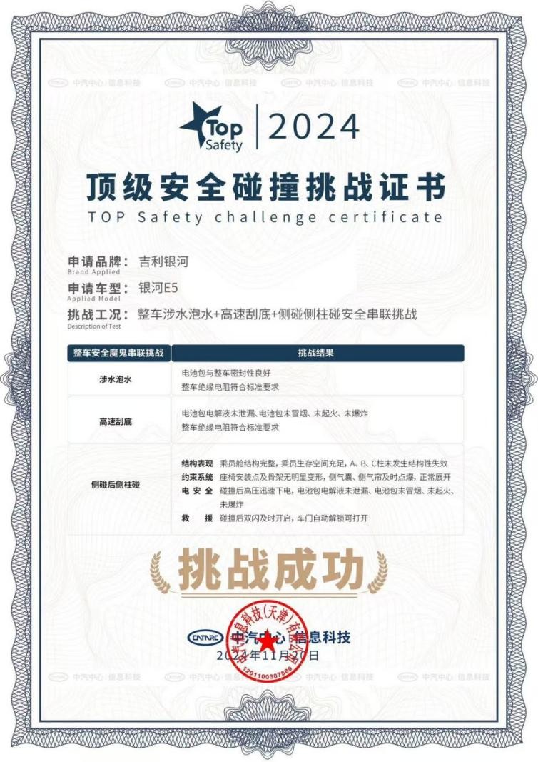 因為這樣出色的安全表現,吉利銀河E5獲頒TOP Safety中國汽車頂級安全碰撞挑戰證書,為更多用戶選擇這款10萬級純電SUV提供了充足的信心。