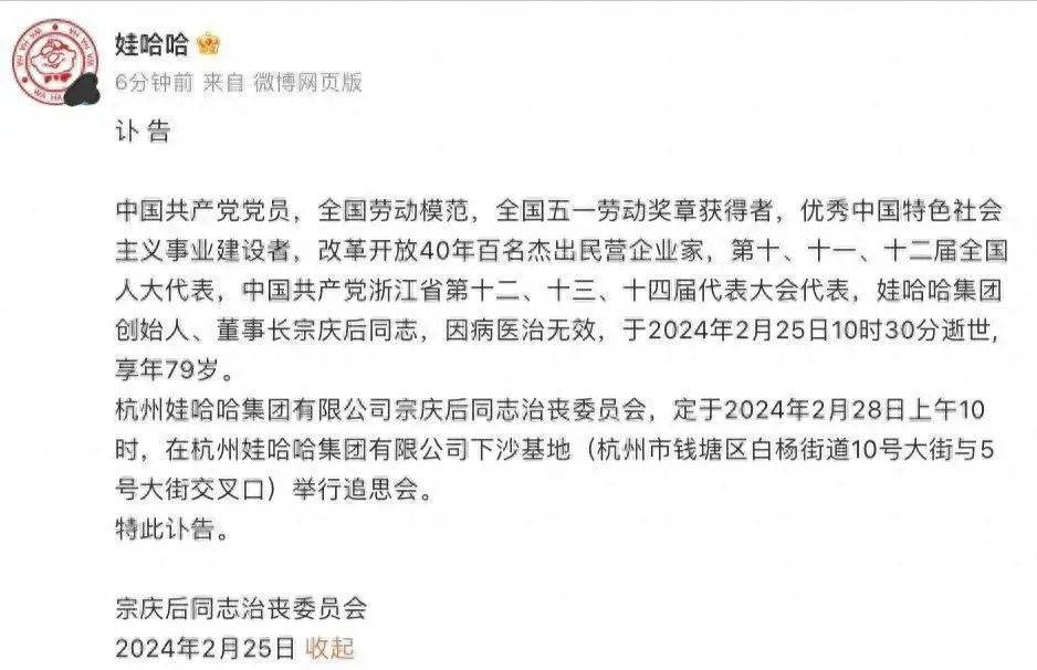 【永恒的榮光】 2月25日,娃哈哈集團官方網站上,一則訃告靜靜地躺在首頁。訃告中,詳細記錄了宗慶后同志一生的榮譽和貢獻。他是中國共產黨黨員,全國勞動模范,全國五一勞動獎章獲得者,優秀中國特色社會主義事業建設者,改革開放40年百名杰出民營企業家,第十、十一、十二屆全國人大代表,中國共產黨浙江省第十二、十三、十四屆代表大會代表,娃哈哈集團創始人、董事長。訃告的字里行間,充滿了對他的敬仰和懷念。