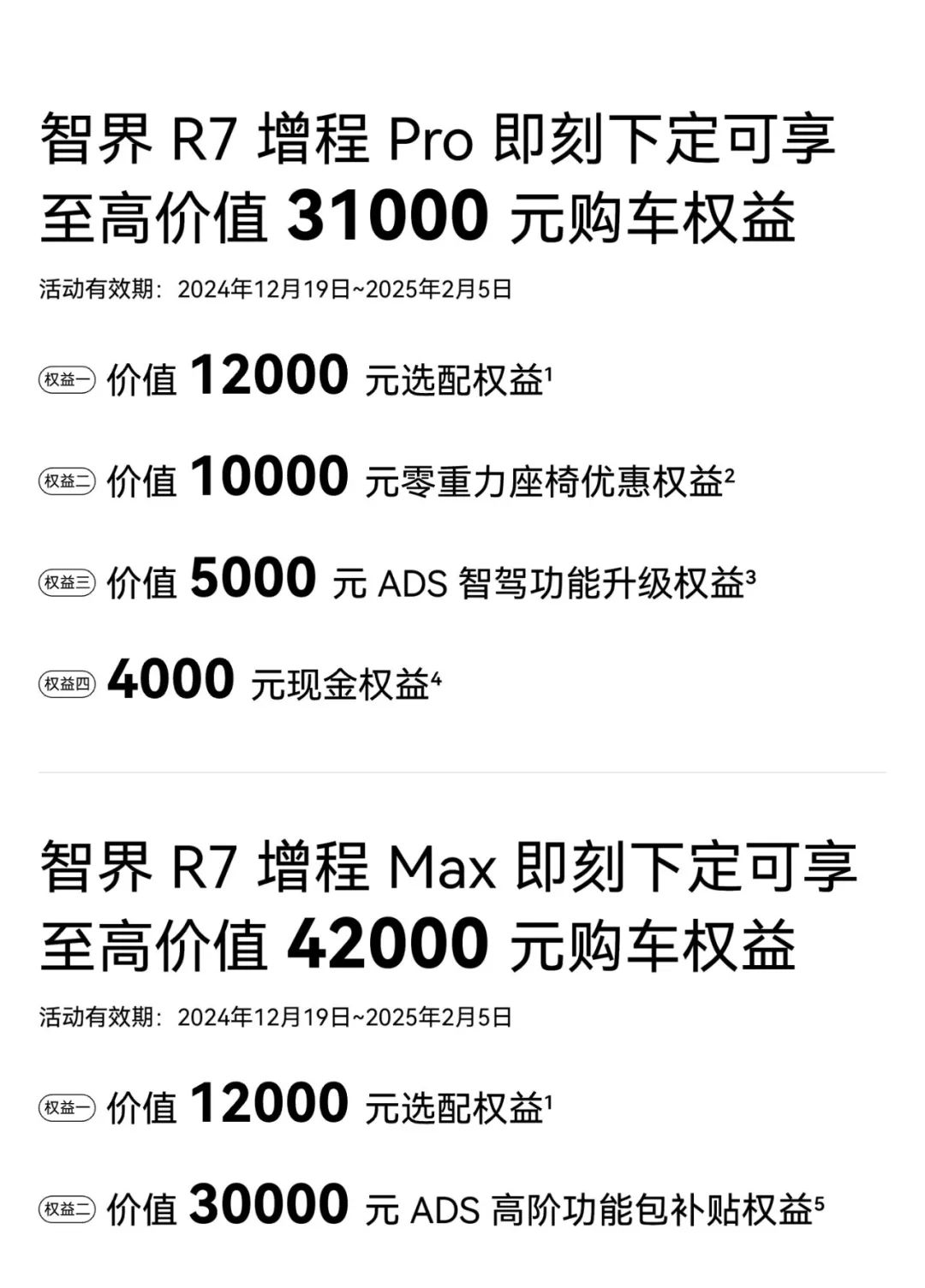 近日,智界R7增程版正式上市,共推出了兩款車型,分別是增程251km Pro版24.98萬元,增程251km Max版28.98萬元,較純電版起售價便宜了整整一萬元。作為智界品牌的首款混動車型,其入門的Pro版未搭載激光雷達,而高配的Max版則與純電版一致,配備了激光雷達。同時,購車即享福利,價值3萬元的高階智駕包將免費贈送,且車輛將于2025年1月5日啟動交付。