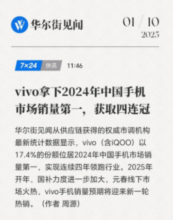 1月9日,CNMO獲悉,根據權威市場調研機構的數據,vivo(含iQOO)在2024年全年以17.4%的市場份額奪得中國手機市場銷量榜首,成為國內首個實現銷量“四連冠”的手機品牌。隨著2025年初國家補貼力度的增強,元旦至春節期間的線下市場熱鬧非凡,vivo手機銷量預計將迎來新一輪的增長熱潮。