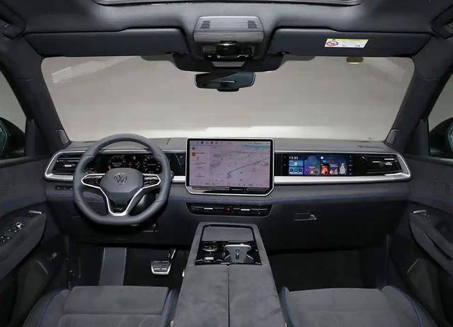 內飾方面,途昂PRO這次也是下了血本。大面積翻毛皮材質配上藍色縫線裝飾,中控臺還有銀色飾條修邊,整體質感非常高級。車內配備了三塊屏幕,儀表屏和副駕屏鑲嵌在中控臺內,中控屏是懸浮式設計,支持CarPlay、CarLife、HiCar手機互聯,實用性很強。方向盤用了觸摸式按鍵,懷擋設計跟ID.系列一樣,操作起來很方便。中控臺下方有無線充電面板和多功能旋鈕,旋鈕上還帶顯示屏,科技感十足。MOS 3.0 GP智慧車聯系統支持6屏聯動,智能化程度非常高。