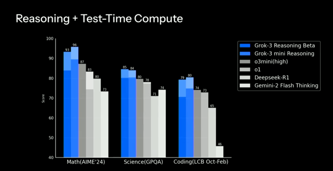 在推理方面,Grok 3同樣表現出色。它不僅能夠進行復雜的思維鏈推理,還在數學、科學、編碼等多個領域展現出了卓越的性能。與最近發布的o3 mini相比,Grok 3在推理能力上更是遙遙領先。