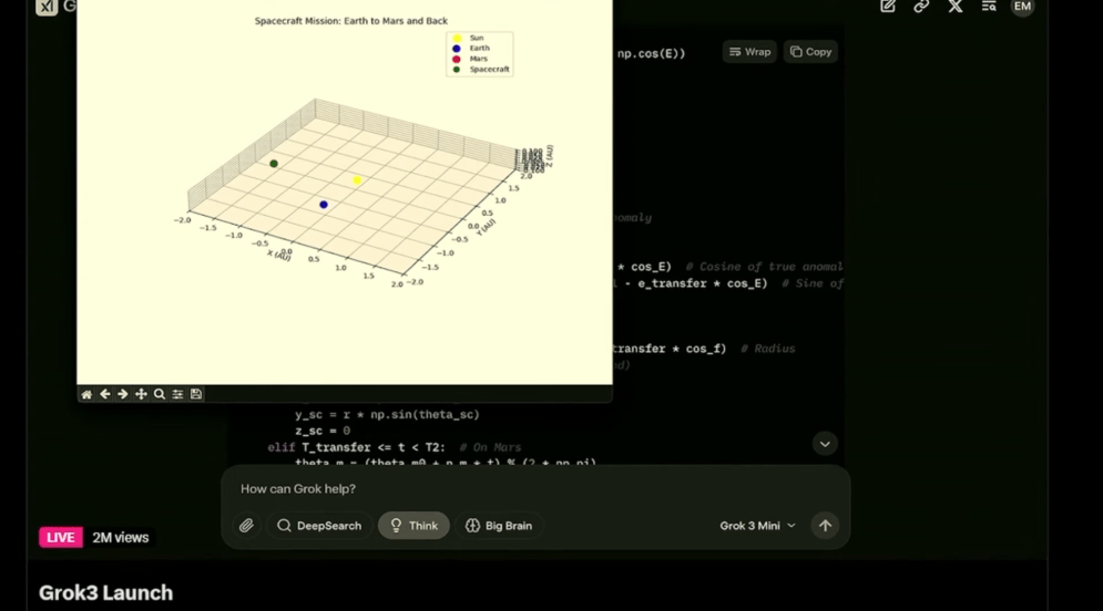 除了在游戲領域的布局外,Grok 3還在其他領域展現了其強大的推理能力。在一次演示中,團隊成員要求Grok 3根據開普勒定律模擬天體運動,并為發射到火星的飛行器規劃軌跡。從演示結果來看,Grok 3成功模擬了太陽、地球和火星的運動軌跡,并規劃出了一條合理的飛行路線。
