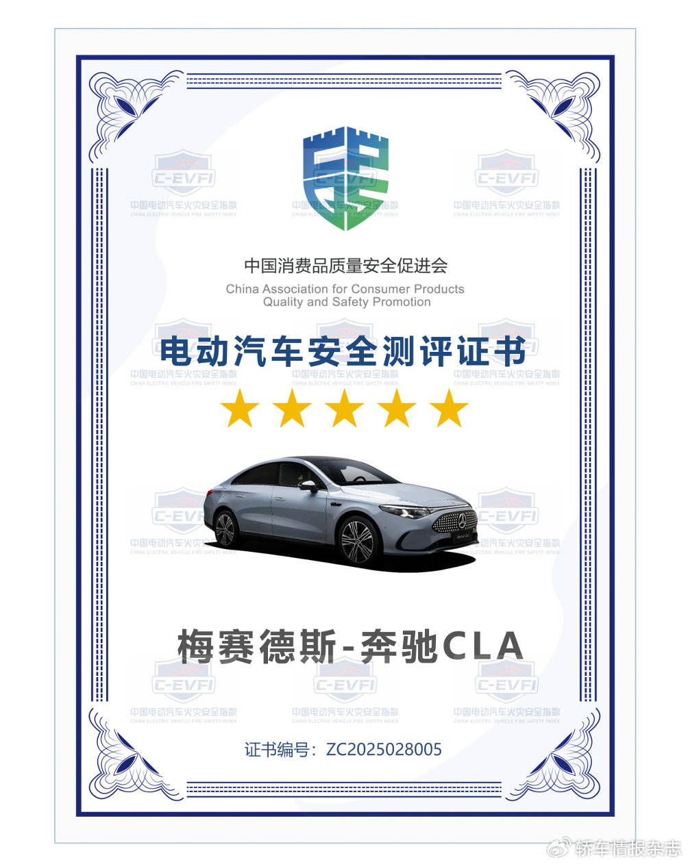 全新純電長軸距CLA采用多級高壓安全理念,在碰撞時車輛的高壓系統可以自動關閉,電池包毫秒級切斷高壓響應,2秒內電壓歸零。日前,全新純電長軸距CLA通過了中國電動汽車火災安全指數的測評,獲得五星安全認證:在第三方測試中,在單個電芯熱失控后,整車未起火、未爆炸,動力電池熱穩定性滿足2026年生效的新國標的要求。