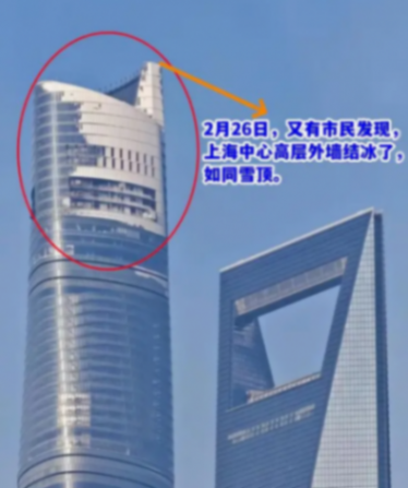 近日,中國最高樓上海中心大廈的頂端被一層白霜覆蓋,仿佛被冰雪封印了一般,網(wǎng)友們紛紛驚嘆,真是高處不勝寒,這不正是《流浪地球》的即視感嗎?2月26日,市民們又發(fā)現(xiàn),上海中心大廈的高層外墻竟然結(jié)冰了,仿佛給它戴上了雪頂?shù)拿弊印?/p>