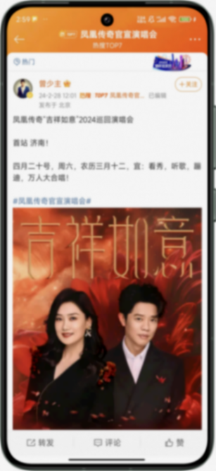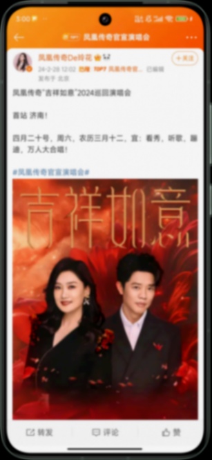 2月28日,#鳳凰傳奇官宣演唱會#登上熱搜。當天中午,玲花與曾毅紛紛在微博官宣2024巡回演唱會首站濟南:“四月二十號,周六,農(nóng)歷三月十二,宜:看秀,聽歌,蹦迪,萬人大合唱! ”網(wǎng)友紛紛回應:“期待一起大合唱。”