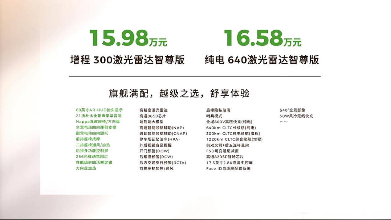 選什么版本?不同版本適合什么人群:純電版,適合日常通勤距離較長、充電方便的用戶,640km的長續航就算是工作日5天通勤再加上周末短途出行也是足夠的,續航長,用車更省心。增程版: 適合有長途出行需求的用戶,1210公里的綜合續航里程,完全沒有續航焦慮了。