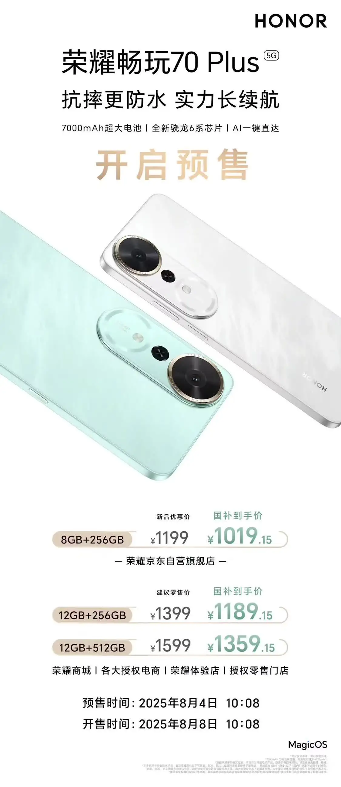 8月4日消息,榮耀手機官微宣布,榮耀暢玩70 Plus手機今起開啟預售,其搭載全新驍龍6系芯片及7000mAh電池,售價區間為1199-1599元(IT之家注:國補到手價1019.15元起),8月8日10時08分開售。