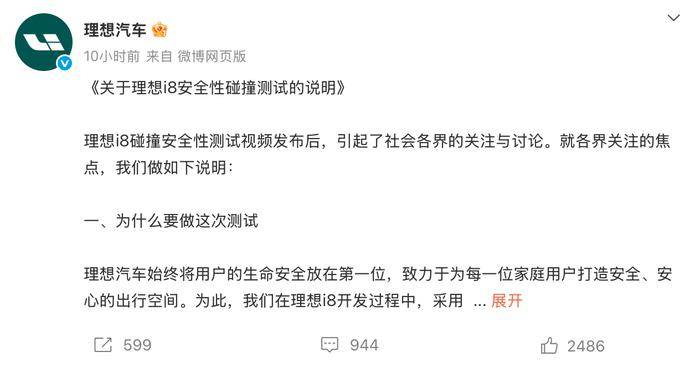 8月3日晚,理想汽車官博發(fā)布《關(guān)于理想i8安全性碰撞測試的說明》