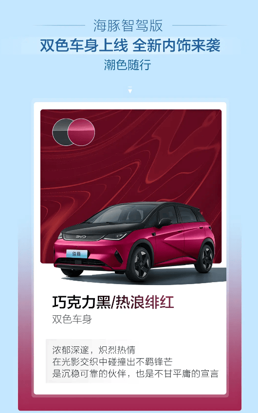 日前,比亞迪海豚智駕版新增3款外觀顏色和1款全新內飾配色,新車將于成都車展亮相。此次新增巧克力黑+熱浪緋紅、貝貝灰+沖浪藍雙色車身以及芋泥紫純色車身,新增燕麥米配色內飾。比亞迪海豚智駕版將提供2款雙色車身、4款純色車身搭配2款個性內飾供消費者選擇。作為參考,目前2025款海豚智駕版提供3款車型,售價區間為9.98萬-12.58萬元。